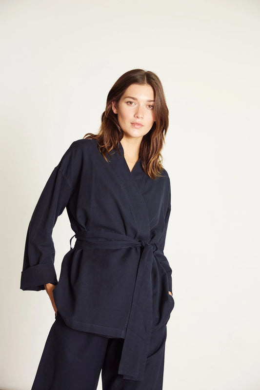 Linen Wrap Set with Pallazo in Navy Blue