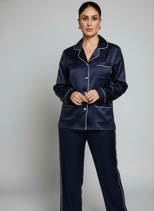 Silk Satin Pyjama set with Piping - Midnight Blue
