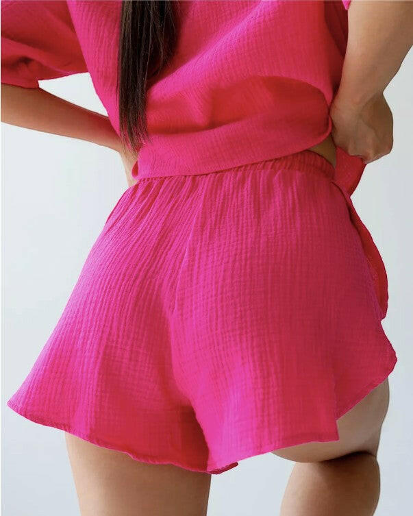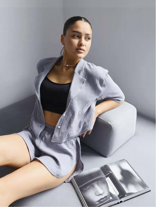 Discover ultimate comfort with our women's muslin cotton booty shorts set. This lightweight shirt and shorts combo is crafted from incredibly soft, breathable fabric, making it a dream to wear. Perfect for lounging or sleeping, this stylish set offers a relaxed fit for all-day effortless comfort.